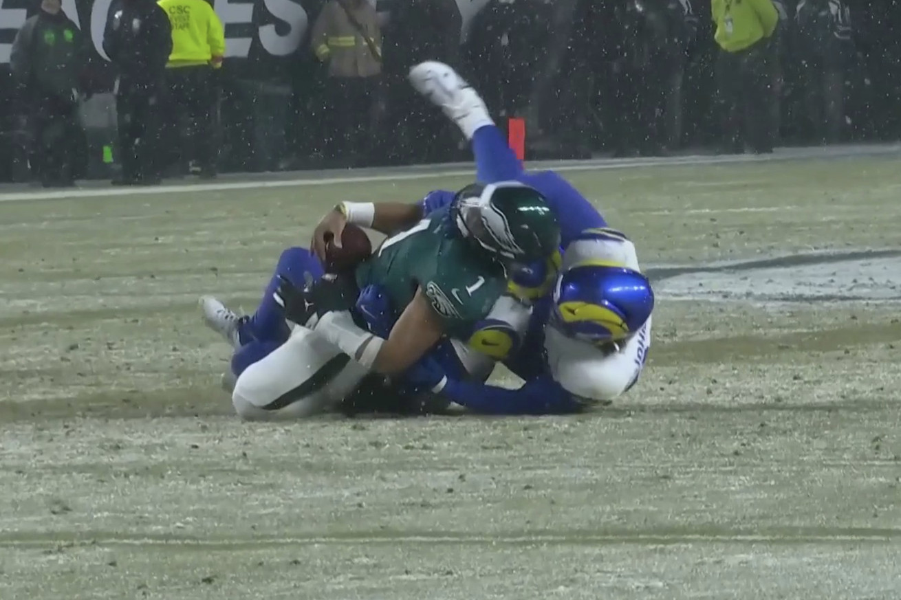 This image from FOX Sports captures the awkwardness of the tackle on Hurts: