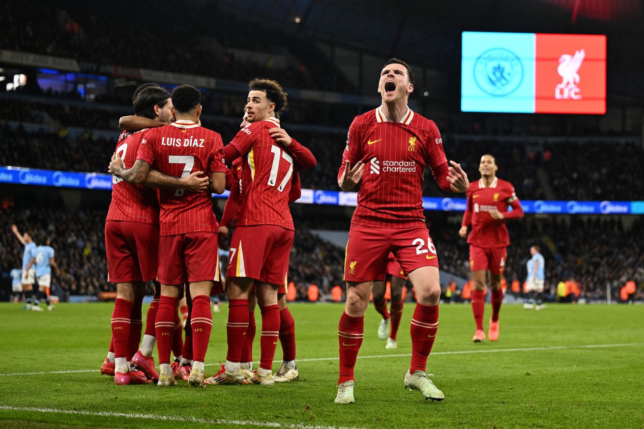 City are starting to wilt now as they push themselves into making things happen, making things ripe for Liverpool to take over once again. Luis Diaz takes an ambitious shot from outside the box that is blocked by Ederson and leads to a corner that almost finds the captain’s head but is cleared by the hosts. City are the first to make a change in the 65th minute, taking off De Bruyne for James McAtee, in an attempt to take control of their midfield once more. Doku once again beats Trent Alexander-Arnold and the hosts make a run at goal, and some chaos makes sure that the ball is moved away thanks again to our centerbacks.