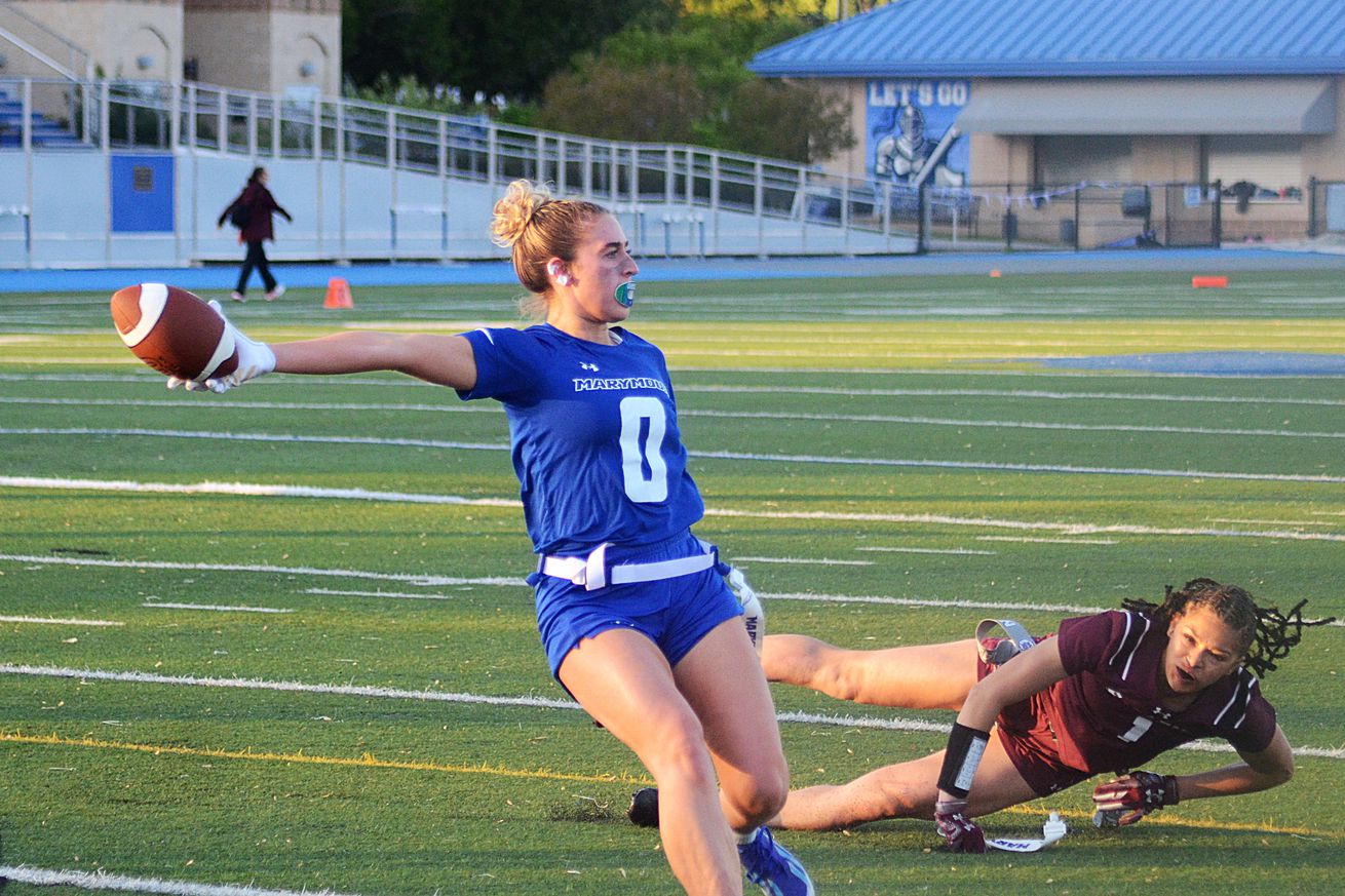 “That’s what made this really interesting. A lot of our youth players are soccer players and basketball players, and we teach them how to play flag,” Rivera says. “We did not recruit — we didn’t have time to recruit flag football players. We have taken athletes at Marymount, converted them into flag players, and they’ve been tremendous.”