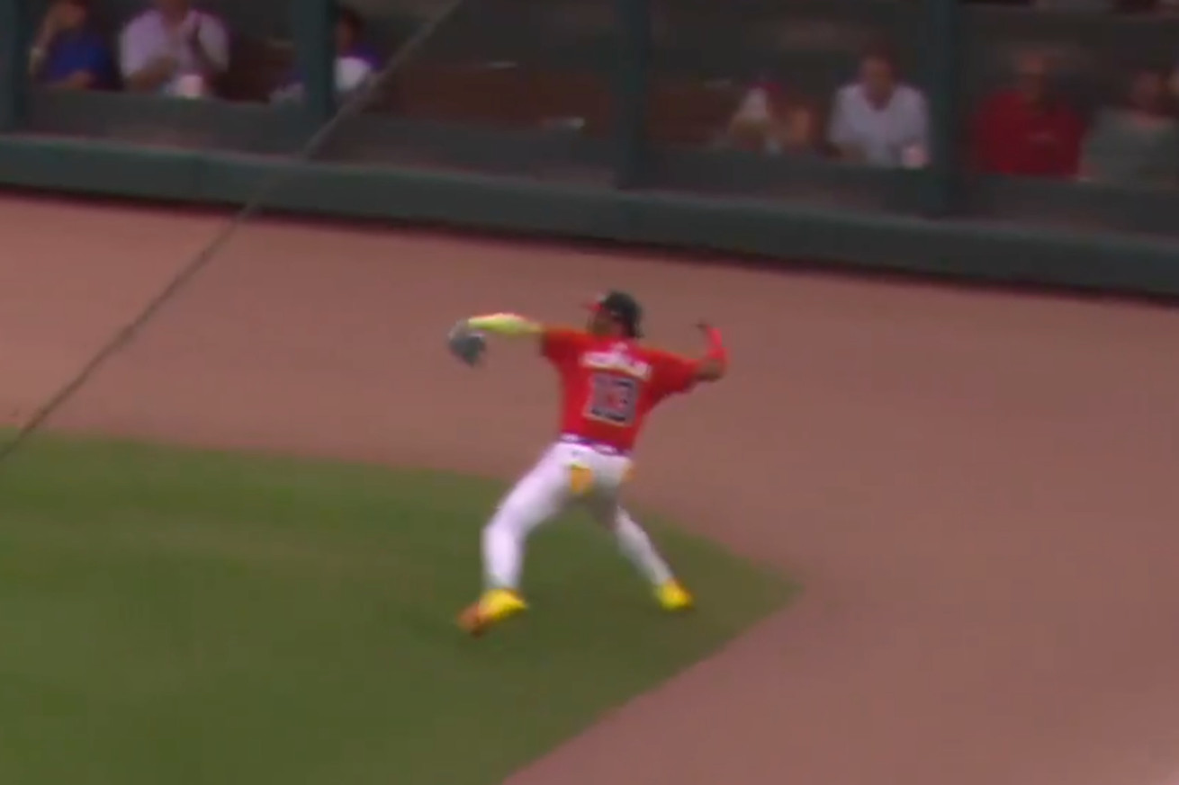 As someone paid to describe sporting moments, I am at a loss to describe this throw beyond saying THIS IS MIND-BLOWING. Acuña makes this throw without a crow-hop or a pro-step; he simply catches the ball over his shoulder, pivots, and throws a supersonic missile into third baseman Nacho Alvarez Jr. And some credit goes to Alvarez who sold the play at the end, waiting until the last possible moment to get his glove out to snare this frozen rope from Acuña.