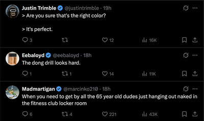 I think the comments about the color here are all very salient. Why in the world did they need to be a flesh tone? If these were just blue or red, or a mix of the two it would be totally fine. I’m sure there is a color of vulcanized rubber for this drill that doesn’t make it look like a phallus — but nah, they went with this one.